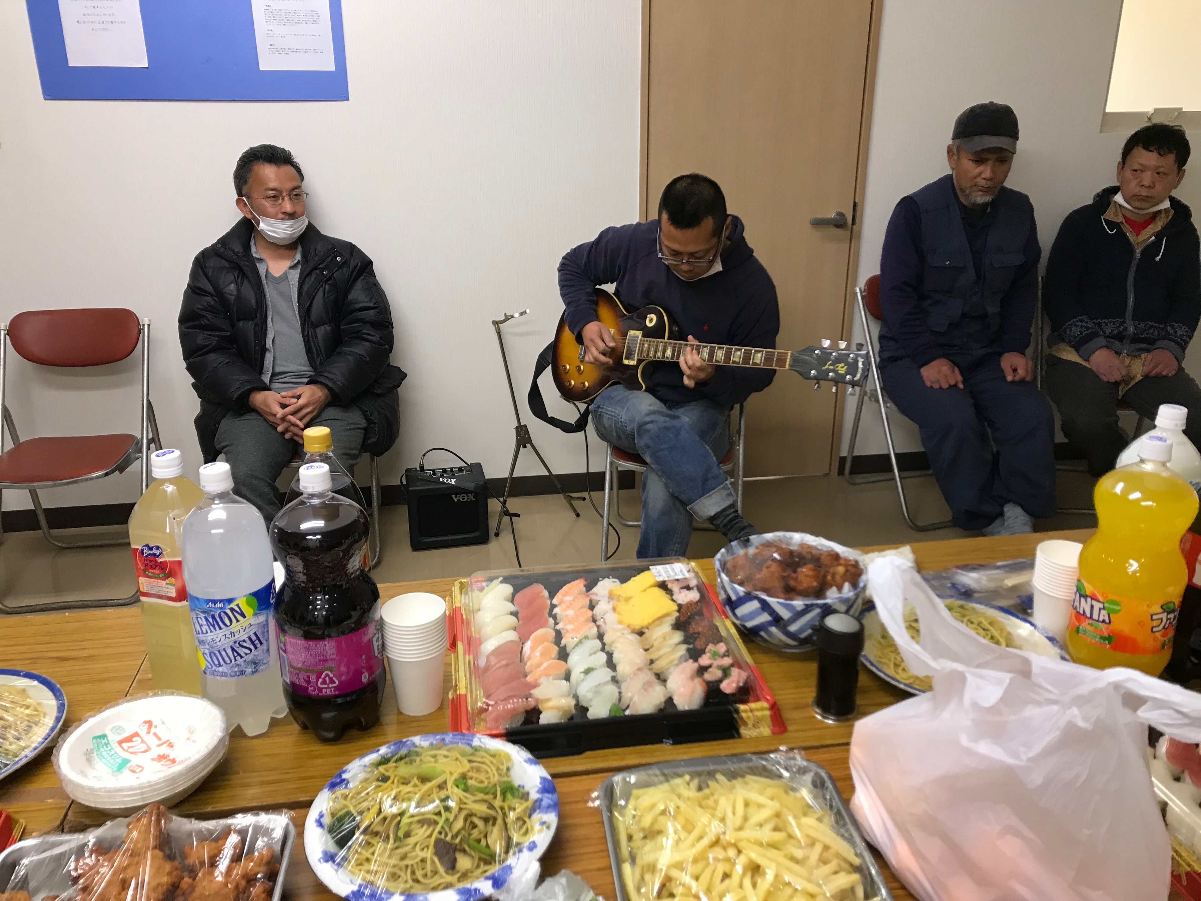 祝賀会当日は、仲間のエレキギターの演奏で幕が上がりました。目にも止ま