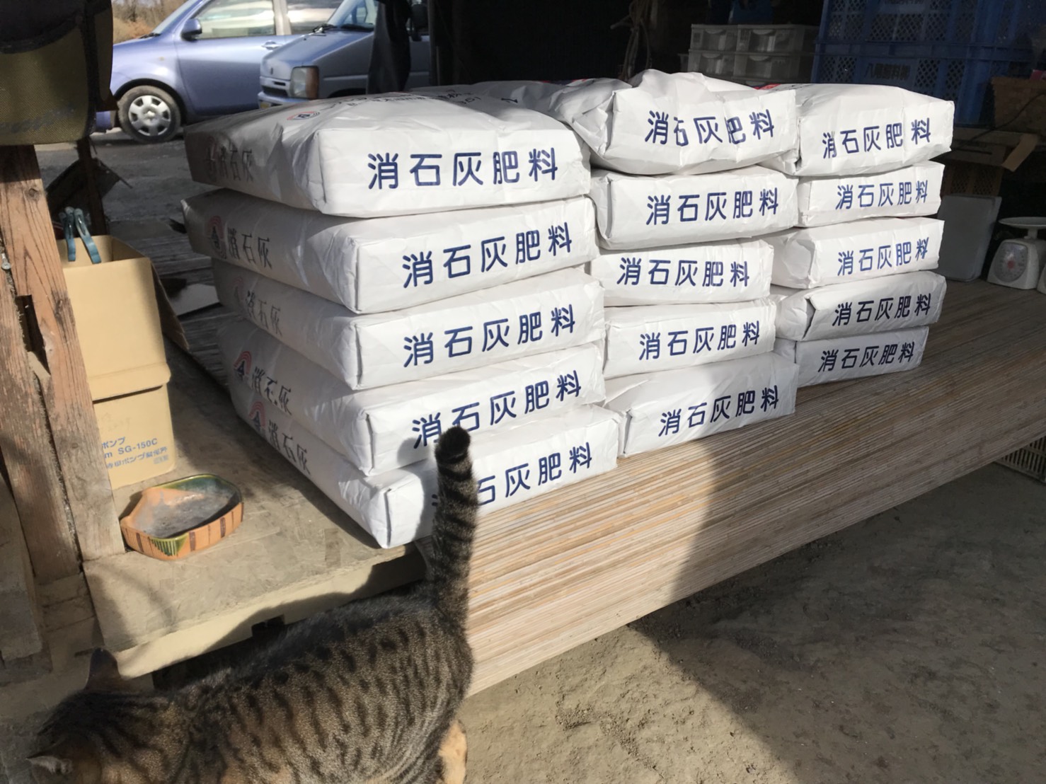 (シーサーさん、にわとりを宜しくお願いします。)(鳥インフルエンザ対策の為、石灰をまきます。猫のエサではありませんね。)