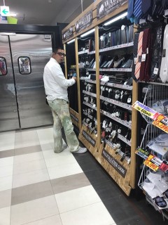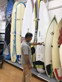 サーフボードを真剣に見つめるミサオさん。我々の住む宇陀にドンキホーテがあれば