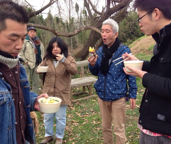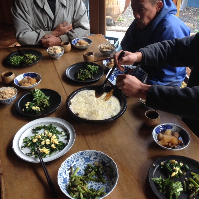 お昼はお世話になっている猪飼さんの奥様による座の里で とれた野菜を使ったお料理をいただきました。里芋の上に 山芋がかかったグラタン、菜花のペペロンチーノ、ごま油 とアミエビを和えた春菊のサラダ、大根と鶏肉の煮物、玄 米ごはん等々最後にサツマイモを使ったスイーツ!! ご馳走様でした。最高に美味しかったです!! 仲間たちで種を蒔き、仲間たちと収穫し、仲間たちと喜び を分かち合いながら食べる、やっぱり仲間は大事です。 そして虫の穴だらけでも座の里の野菜を注文してくださる 皆様のご支援に心から感謝しています。 ではこのへんで失礼します。ありがとうございました。
