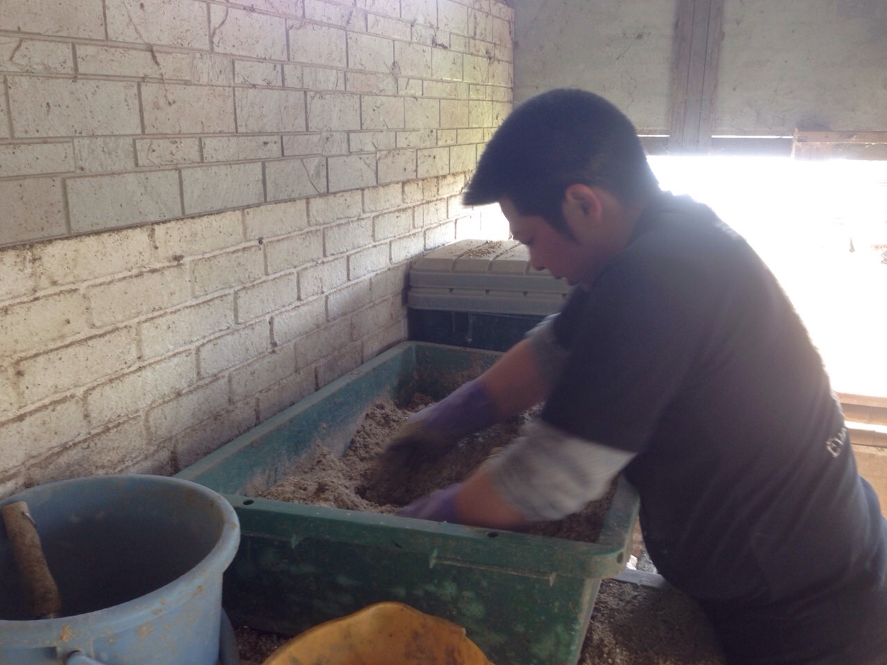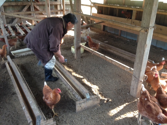 鶏のエサ作りに奮闘中アキ君!もう板についてきました。