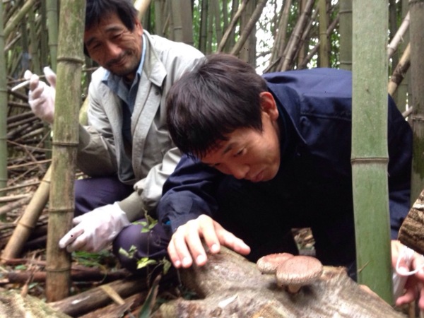 久々の第2農園では原木から立派なシイタケが。 新しく来た仲間のカメちゃんが興味深く覗き込みます。
