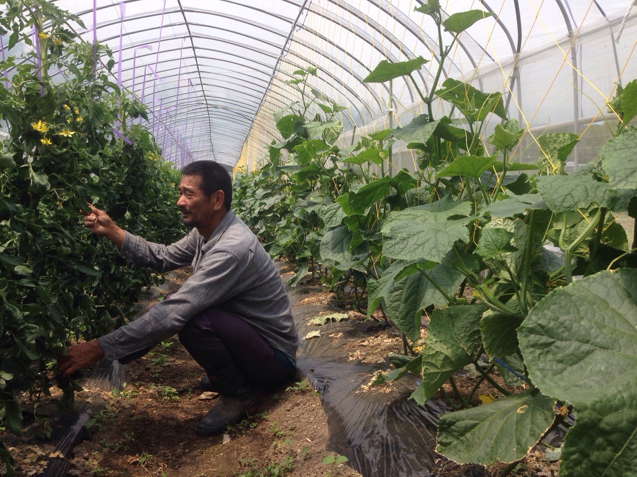 トマト手入れ中のケイさん。美味しいトマトにする為、芽かきや水など毎日手入れしています。