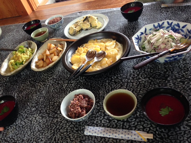 ジャガイモのチーズ焼き、なす ズッキーニの天ぷら、etc