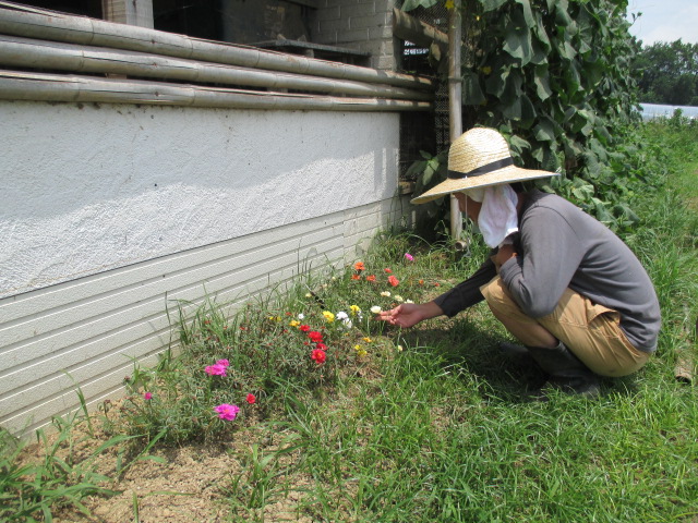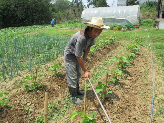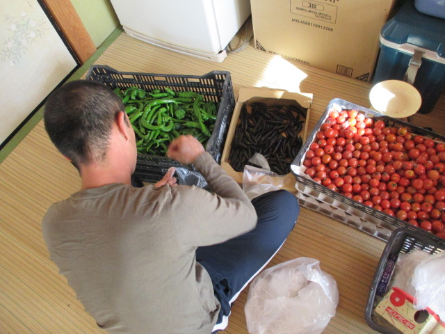 拓冬君は、インゲン採りに大忙しです。遠くに見えるのはKさんです。