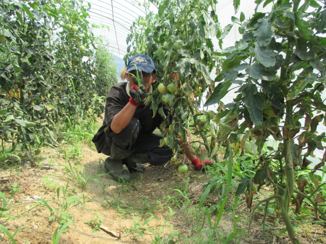 トマトの摘芯、剪定作業中の拓冬君。