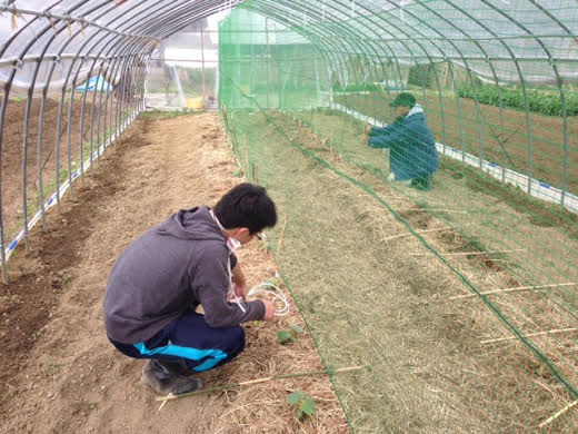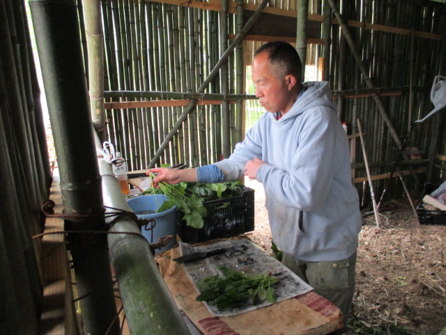 座の里で大活躍中のイチさん!絹さやを収穫中です。