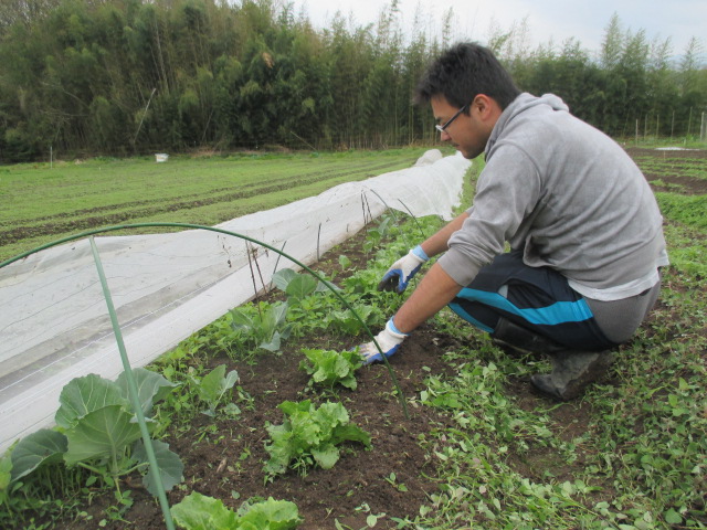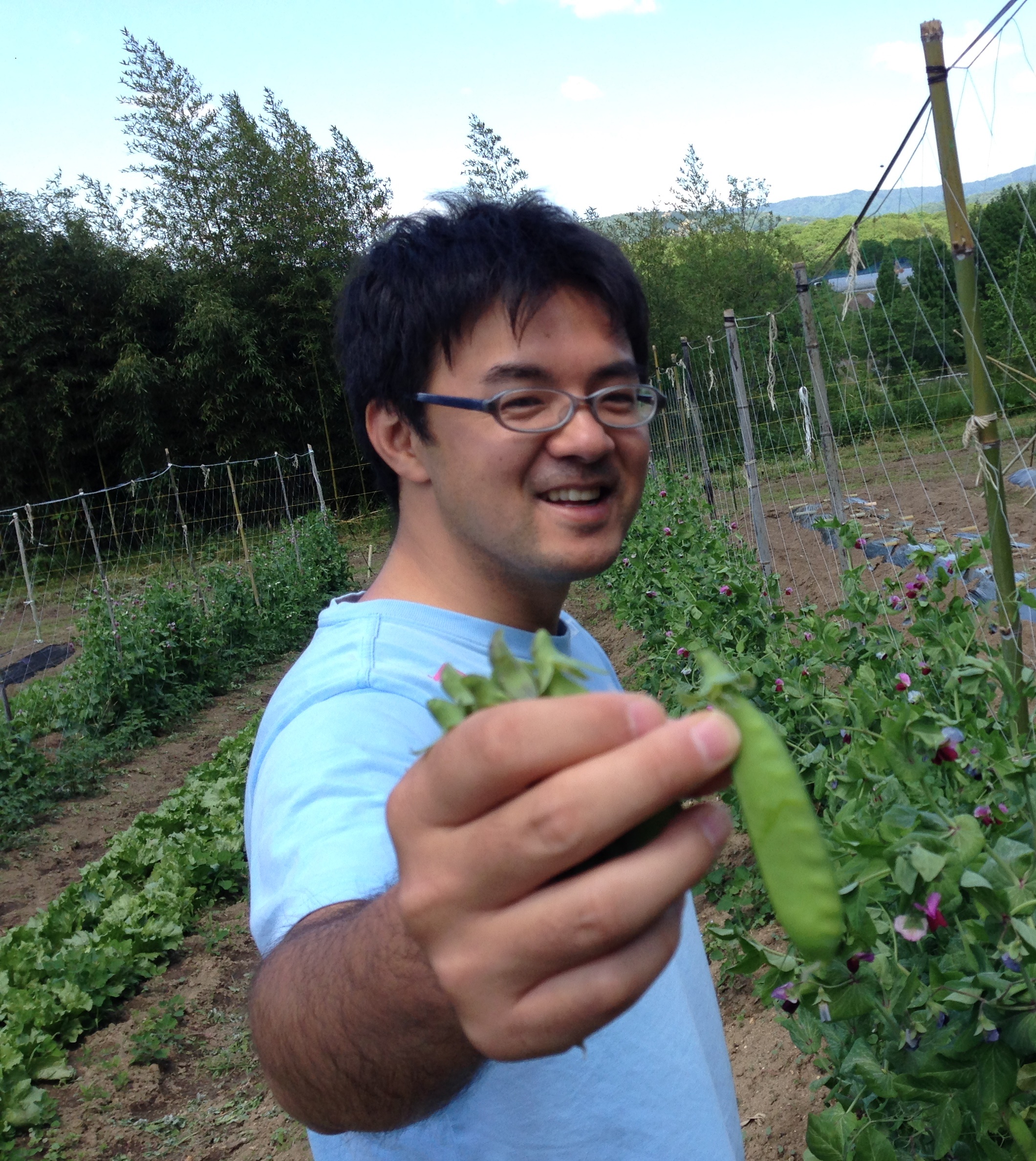 まずは栽培状況からです。スナップエンドウを採るマサヤさん。