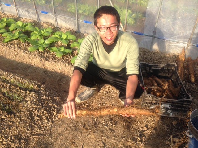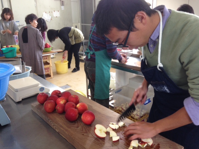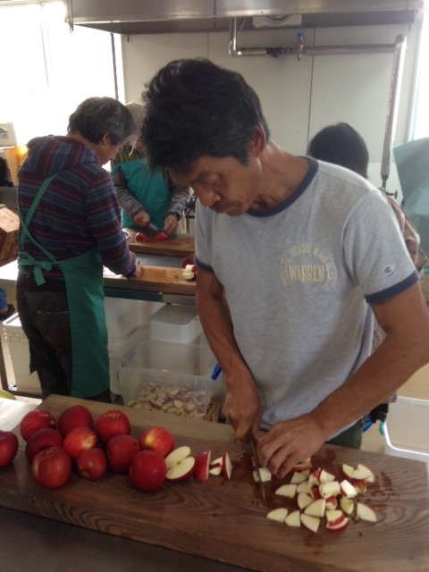 こんにちは。今日は酵素ジュース作りの模様や畑の 栽培状況をお伝えします。 担当のヒデです。 日曜日、タク君と私で猪飼さん主催のワークショップ に伺いました。場所は梅林で有名な月ヶ瀬村です。危なっかしいので後はタク君に任せました。紅玉リンゴ、 レモン、砂糖を使っての酵素ジュース作りです。簡単です。 ジュース作り終了後は豪華なオーガニックランチをいただき ました。