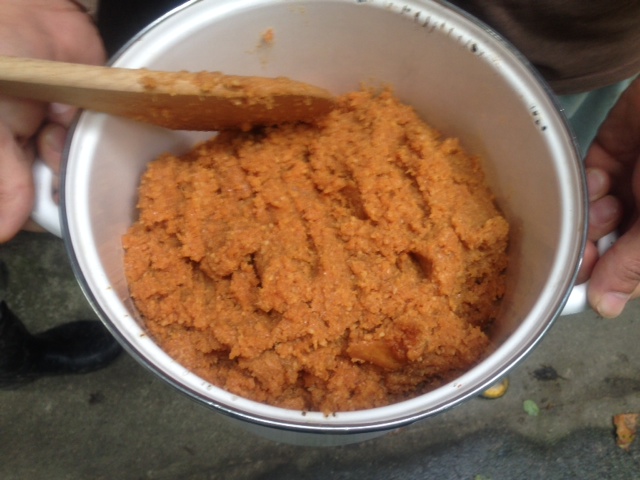 今回から、蔵出し味噌が入りました。初物ですよ~! 今年の初めにヒデさんと仕込んだ味噌です。 白い、甘い、体に良い いいことずくしです。